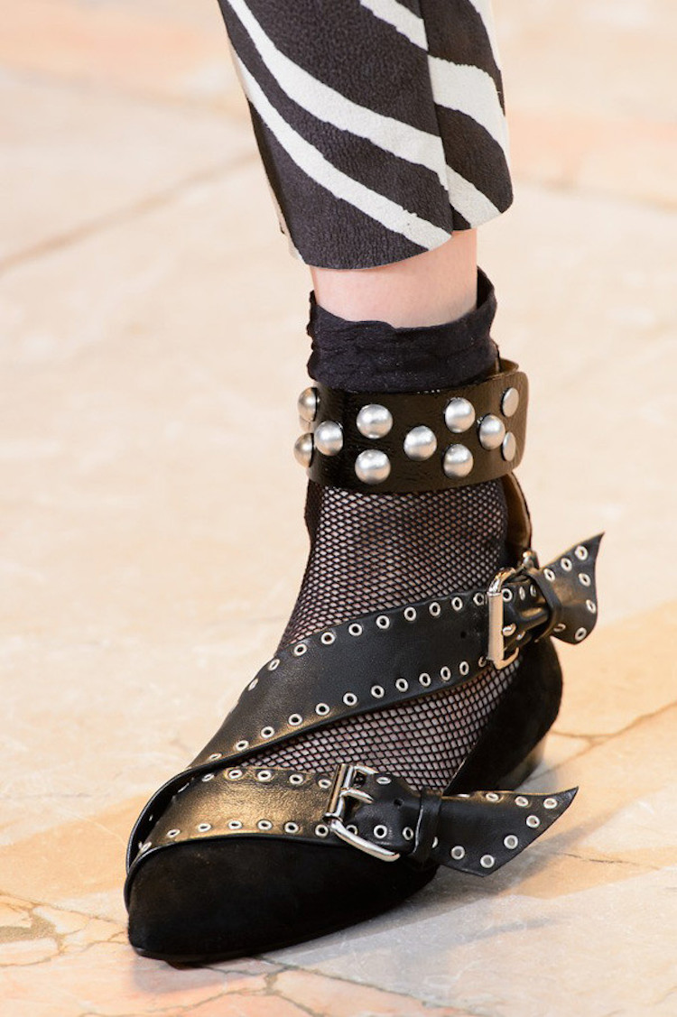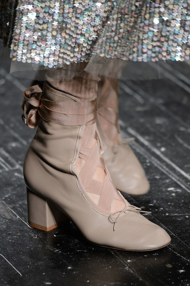 芭蕾舞鞋一直都是永不过时的款式,不管是日常通勤还是平日休闲出游都可以派上用场。今年秋冬秀场将绑带芭蕾舞鞋做了一些新的改变。像Valentino的裸色高跟芭蕾舞鞋和Isabel Marant 的皮革铆钉款,都是在芭蕾舞单鞋基础上的改变。