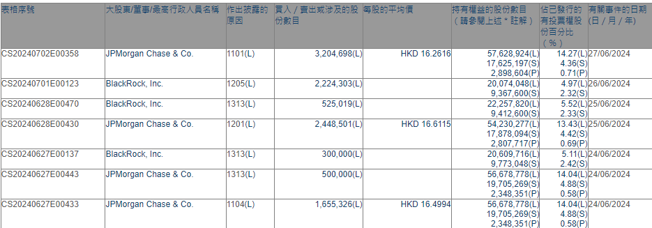 港交所文件显示,摩根大通6月27日将其对赣锋锂业H股的多头头寸从13.48%增至14.27%,买入约320.47万股。