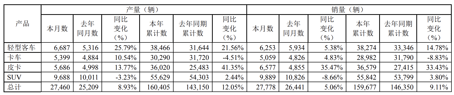 江铃汽车7月2日公告,2024年6月总销量为27778辆,同比增长5.06%。其中,轻型客车销量为6253辆,同比增长5.38%;卡车销量为5059辆,同比增长4.83%;皮卡销量为6577辆,同比增长35.47%;SUV销量为9889辆,同比下降8.66%。累计销量方面,2024年上半年总销量为159677辆,同比增长9.11%。