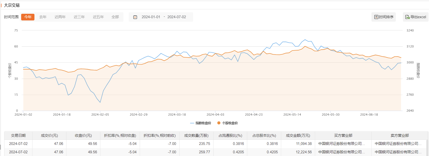 7月2日,金诚信今日大宗交易成交495.52万股,成交额2.33亿元,占当日总成交额的56.85%,成交价47.06元,较市场收盘价折价5.04%。