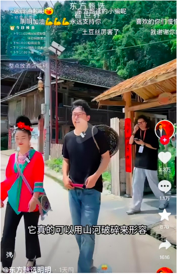 6月22日,另一主播明明在贵州肇兴侗寨带货贵州文旅,用“山河破碎”来形容云贵高原的地形,主播YoYo微博里对当地蜘蛛的调侃也同步被翻拣出来。随后,贵州文旅删除所有东方甄选相关视频。29日上午,主播明明在网上发布道歉信息,“祸从口出”频频上演,持续占领负面热搜。