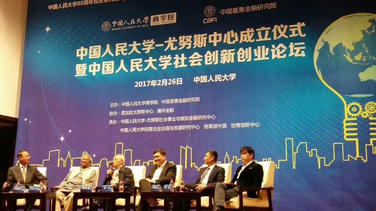 同时,更为重要的是,中国人民大学尤努斯中心正式成立了,这也让我感到特别高兴。未来,通过尤努斯中心,我们将接触到更多的年轻人以及学界人士,得到他们的关注,并能够让他们利用自己的智慧和专长,来共同推动尤努斯的发展。