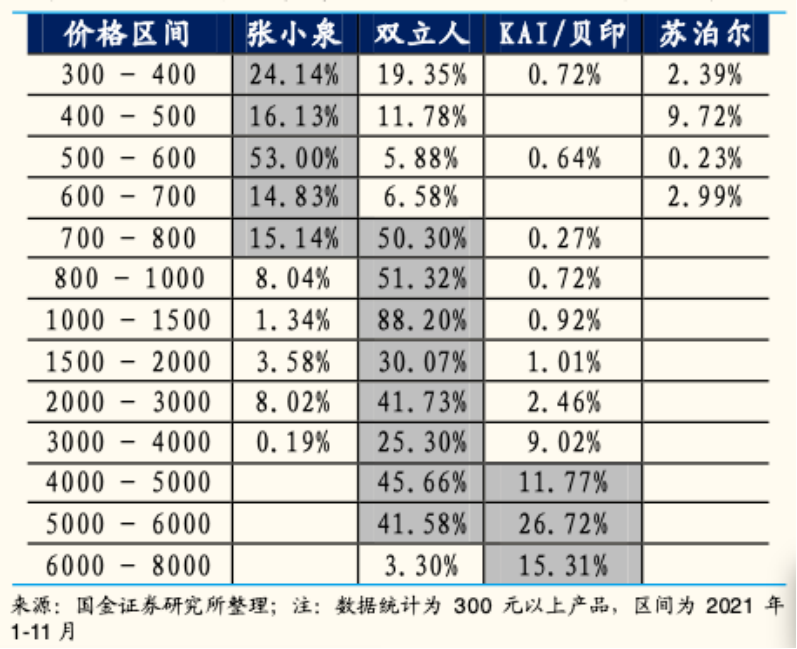 在国金证券研究所的研报中,给出了一份不同价格区间的市场占有率对比表。张小泉的优势在300-600区间,双立人的优势在700-6000之间,再往上,就是日本贝印了。