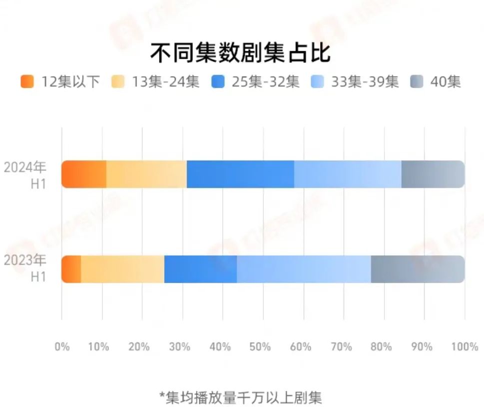 从数据上,能更直观地看出“长剧向短”的趋势。上半年中,12集以下剧集占比超10%,较同期占比翻倍,25-32集剧集占比提升8.7%,33集以上剧集整体占比减少14.2%。