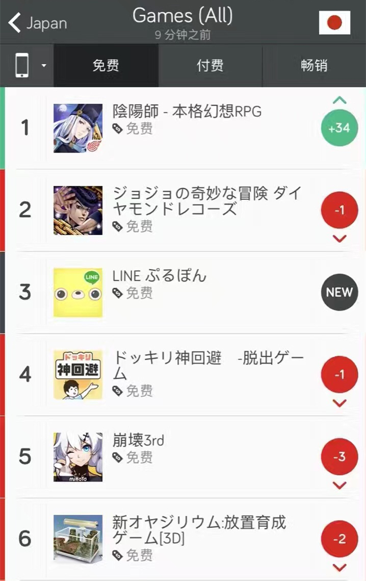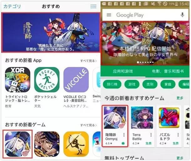 2月23日上午《阴阳师》在日本发布后,成绩就一路高歌猛进,随即拿下了免费榜榜首的位置,至截稿时,《阴阳师》在日本App Store免费榜排第2,畅销榜排第74,还拿下了App Store和Google Play首页大图推荐及首页新游推荐。