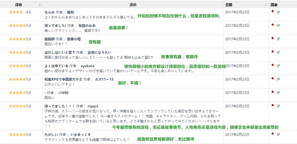 在玩家评价中,大多以“画面美”、“细节做得好”、“故事有趣”等为主,与国内玩家刚接触《阴阳师》时的评价如出一辙。
