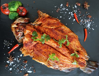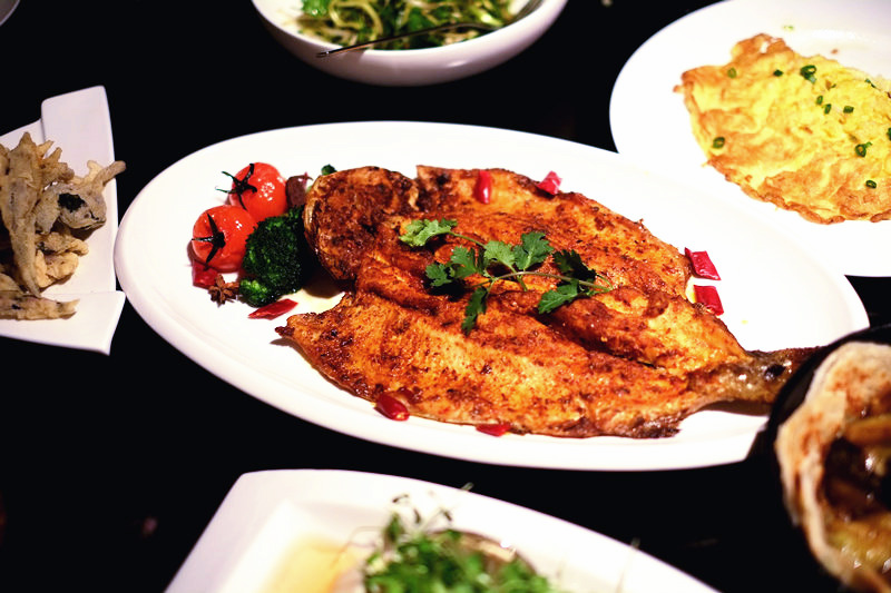 在14道菜中,Kevin自己最满意的是外焦里嫩、肉鲜皮香的烤虹鳟鱼。“我们的鱼是当日捕捞的怀柔虹鳟鱼,现杀和处理后把鱼肉展开,加入辣椒、花椒、糖、盐、孜然等调料。先焗后烤,保留鱼最原本的新鲜和美味,”Kevin非常自豪地向界面新闻记者推荐,“如果我每天在餐厅只能吃一道菜,我就要吃(烤虹鳟)鱼。”
