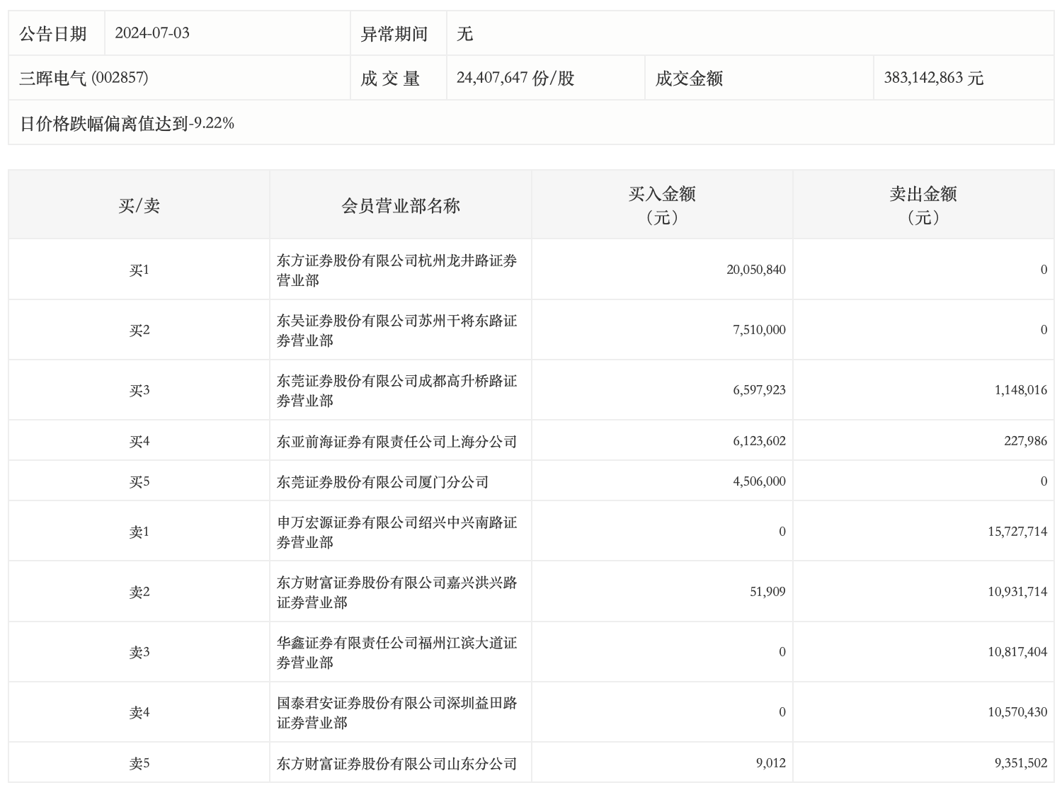 7月3日,三晖电气今日跌停,龙虎榜数据显示,上榜营业部席位全天成交1.04亿元,占当日总成交金额比例为27.05%。其中,买入金额为4484.93万元,卖出金额为5877.48万元,合计净卖出1392.55万元。