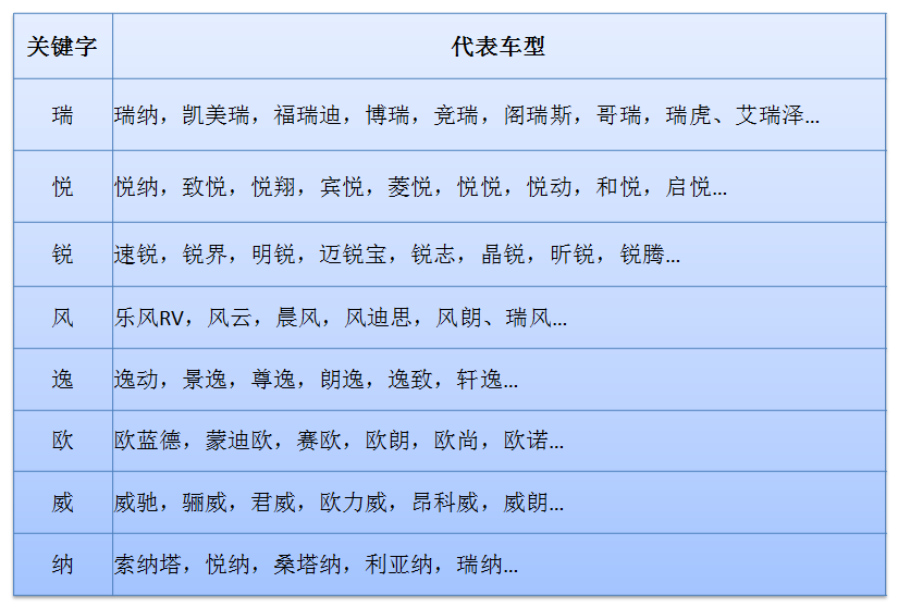 可以看出,在汉字中,瑞、悦、锐最受欢迎。对照下面的详细列表,看看这些车型是不是经常出现在我们视野中?