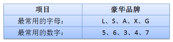 上面提到豪华品牌命名中,字母出现的概率最大,而最受豪华品牌欢迎的字母为L、S、A,如GLA、GLK、RLX、TLX,还有不少L用在最后代表了“加长”的含义,如A4L、A6L、S60L、Q50L等。最受豪华品牌欢迎的数字则为5、6、3。