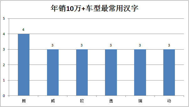 我们筛选了年销10万+的车型,发现60%的车型名字为纯汉字,其中朗字最受欢迎,其次为威、欧、逸等。