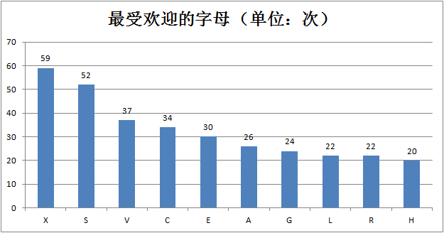 从频次排序看出,车型命名最受欢迎的字母是X,其次是S,再次是V。