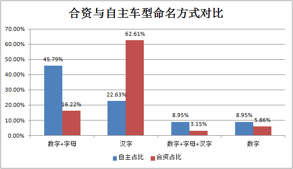 统计结果显示,合资品牌和自主品牌的命名方式出现了有意思的对比:多从国外引进的合资品牌车型更喜欢用纯汉字(63%),而自主品牌却更多地使用了“字母+数字”(46%)。