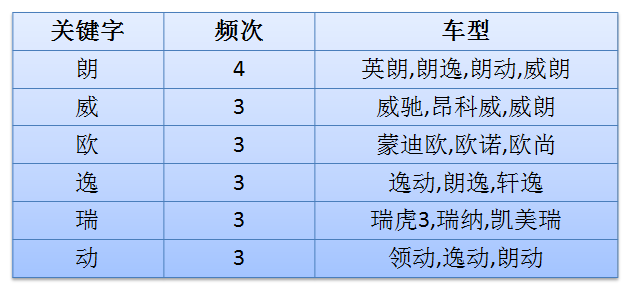 值得注意的是,整体最受欢迎(频次均超过10次)的悦、锐、风、纳都没有出现在高销量车型的常用字中,说明这些字虽然整体被用的频次比较多,但却未能与高销量高度匹配。