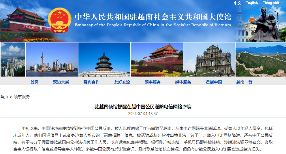 7月4日,中国驻越南使馆发文提醒在越中国公民谨防电信网络诈骗。全文如下:
