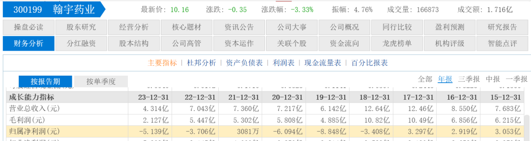 2018年,翰宇药业净利润由正转负,当年净利润亏损约3.41亿元,而在2015年至2017年,其净利润分别为3.05亿元、2.92亿元和3.3亿元。