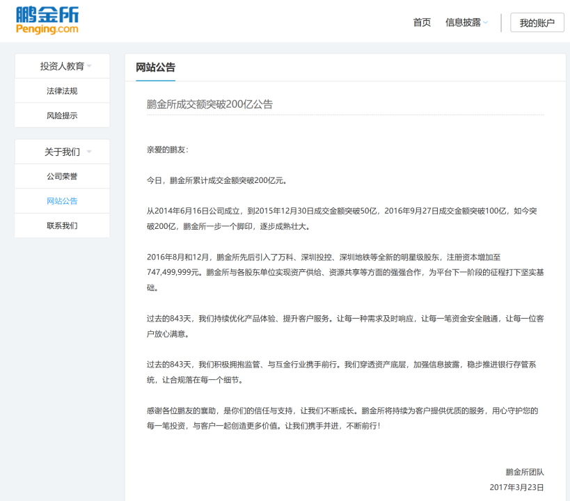 万科入主后,从100亿元到200亿元,鹏金所仅用了约6个月。2017年3月23日,鹏金所宣布累计成交金额突破200亿元,表示“鹏金所将持续为客户提供优质的服务,用心守护您的每一笔投资,与客户一起创造更多价值。让我们携手并进,不断前行!”