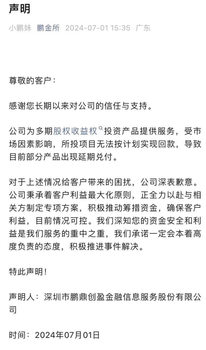 7月1日,鹏金所母公司——深圳鹏鼎创盈金融信息服务股份有限公司(以下简称“鹏鼎创盈”)发布声明称,公司为多期股权收益权投资产品提供服务,受市场因素影响,所投项目无法按计划实现回款,导致目前部分产品出现延期兑付。