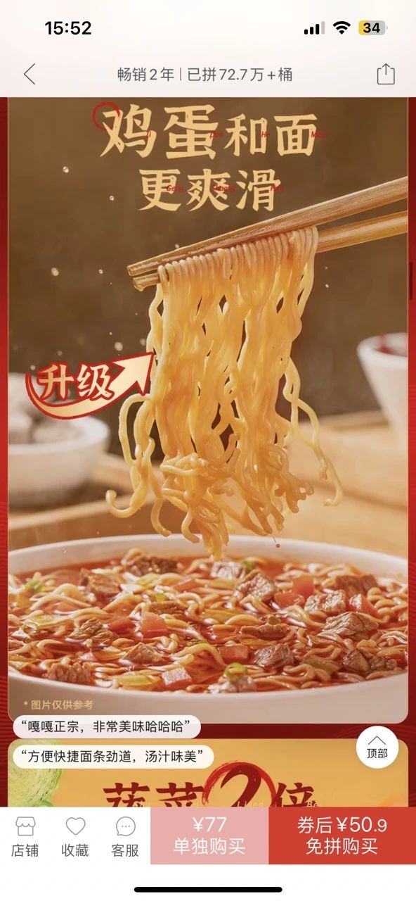 至于线上渠道,则存在商品规格差异,难以直接比较单桶方便面售价。今天小食代搜索看到,以官方旗舰店售卖的“12桶106g经典系列产品” 的券后售价为例,拼多多为27.9元,淘宝为29.9元,京东为54.9元,折合单桶售价在2.3元至4.6元之间。