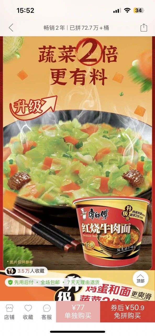 根据小食代翻阅的商品页面,康师傅产品的新升级主要体现在两个方面:“鸡蛋和面更爽滑”,“蔬菜两倍更有料”。同时,还有部分产品强调蔬菜包“新加玉米”,或“汤包更浓郁”。