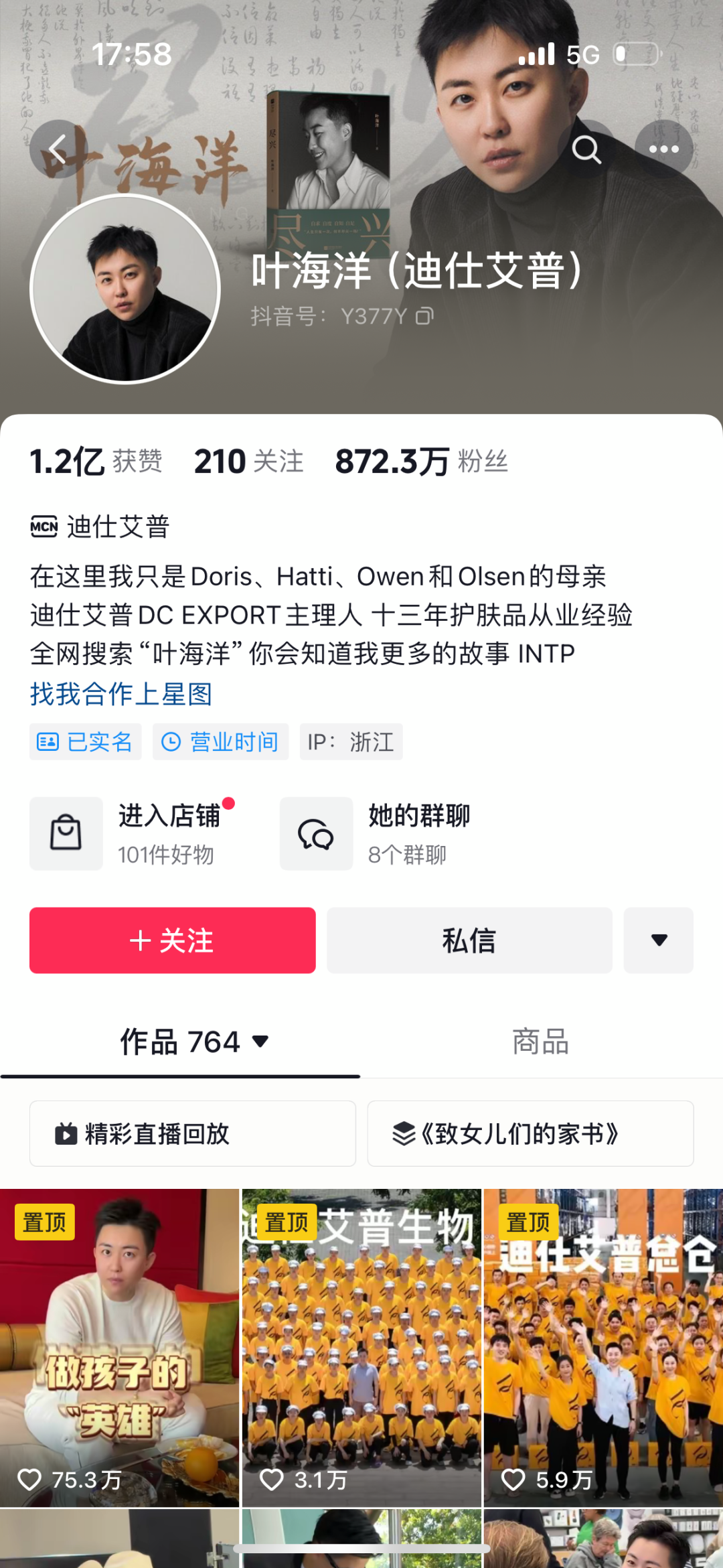 品牌的爆发与创始人IP分不开。在抖音平台上,创始人叶海洋以单身母亲和创业者的双重身份打造技艺共情女性群体的个人IP,并持续对外分享创业经历、产品知识、育儿心得等视频内容。截至目前,叶海洋在抖音平台拥有870万+粉丝,获赞1.2亿,其话题标签#迪仕艾普获得了2.5亿次的播放,品牌抖音旗舰店“DCEXPORT旗舰店”粉丝达到836.3万。