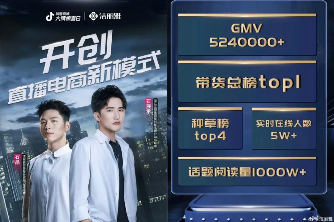典型如洁丽雅“毛巾少爷”石展承在抖音的直播带货首秀。洁丽雅现任总裁“二叔”助阵上场30分钟,销量拿下抖音带货总榜第一;四小时直播,上亿播放量,GMV破五百万。这一成绩,让业界再次看到“企业家IP”的能量。
