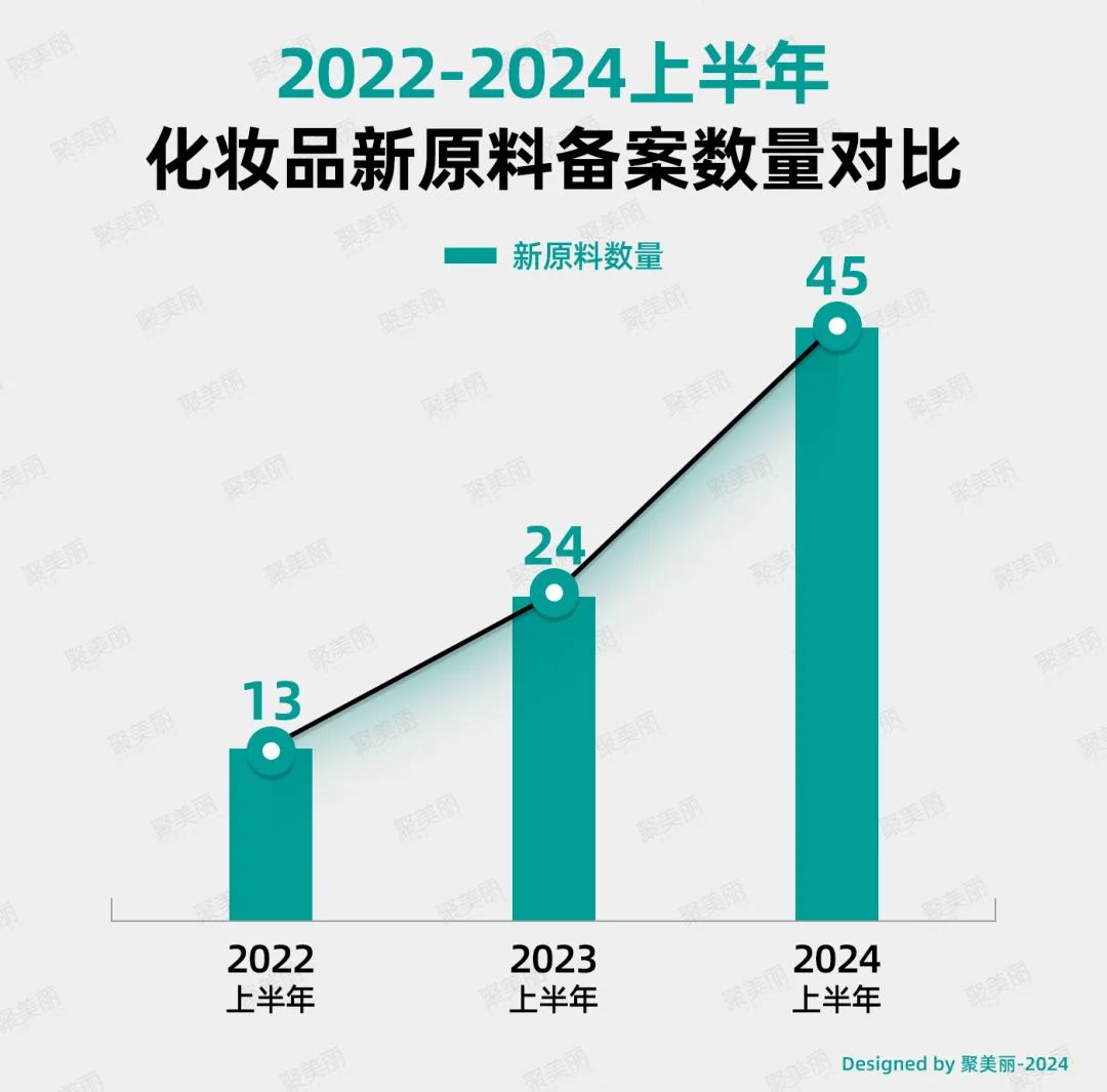 从聚美丽的统计结果来看,2024年上半年以来,国家药监局官网共计45款新原料完成备案,而2023年上半年与2022年上半年分别备案24款、13款。可见,2024年上半年原料备案持续“加速度”,呈现爆发式增长新态势。
