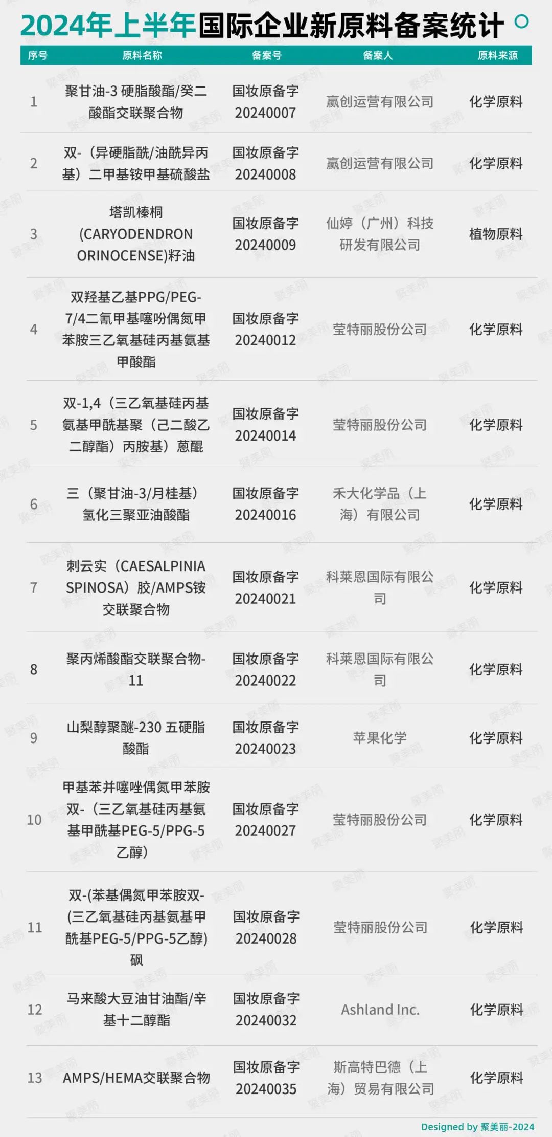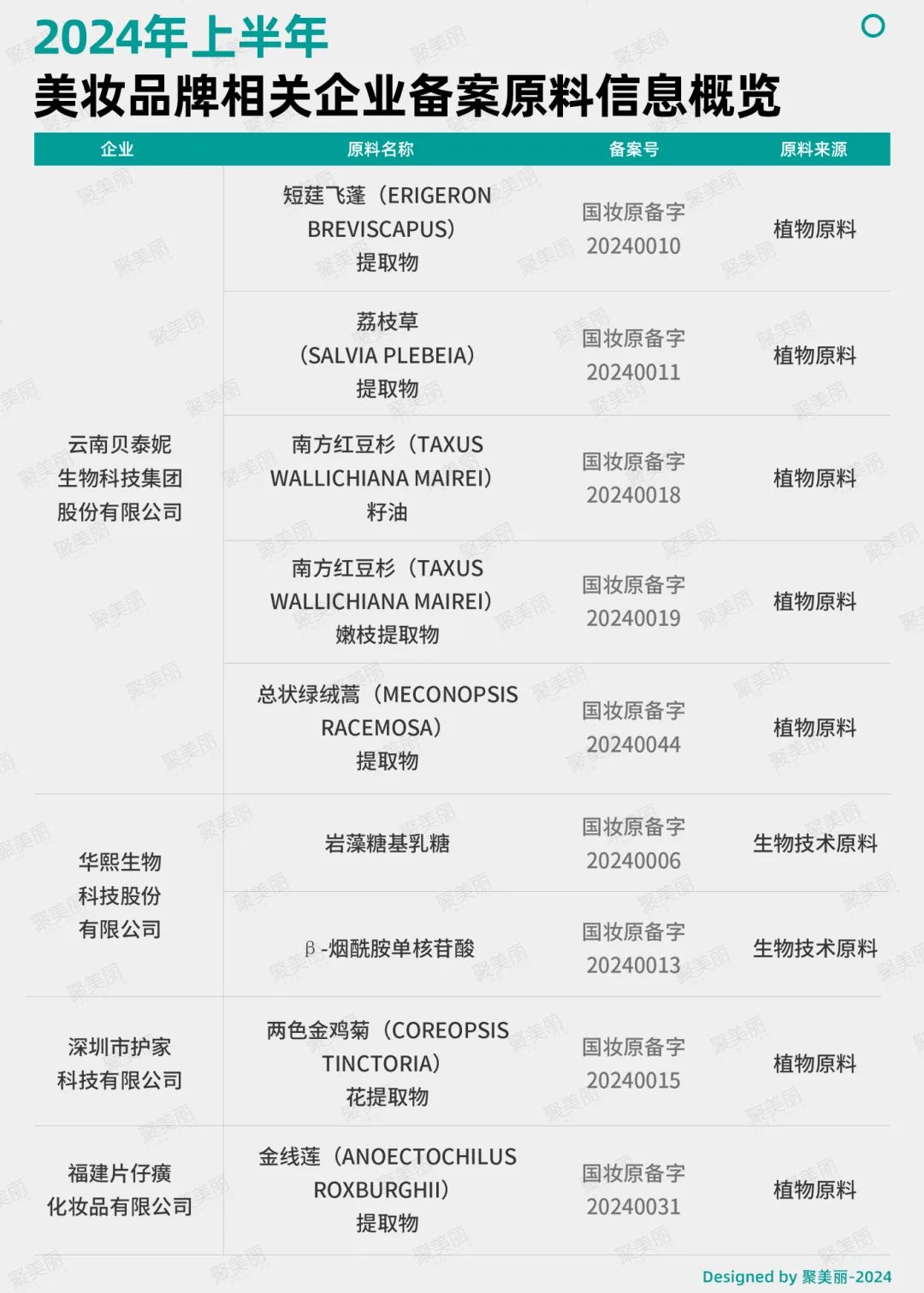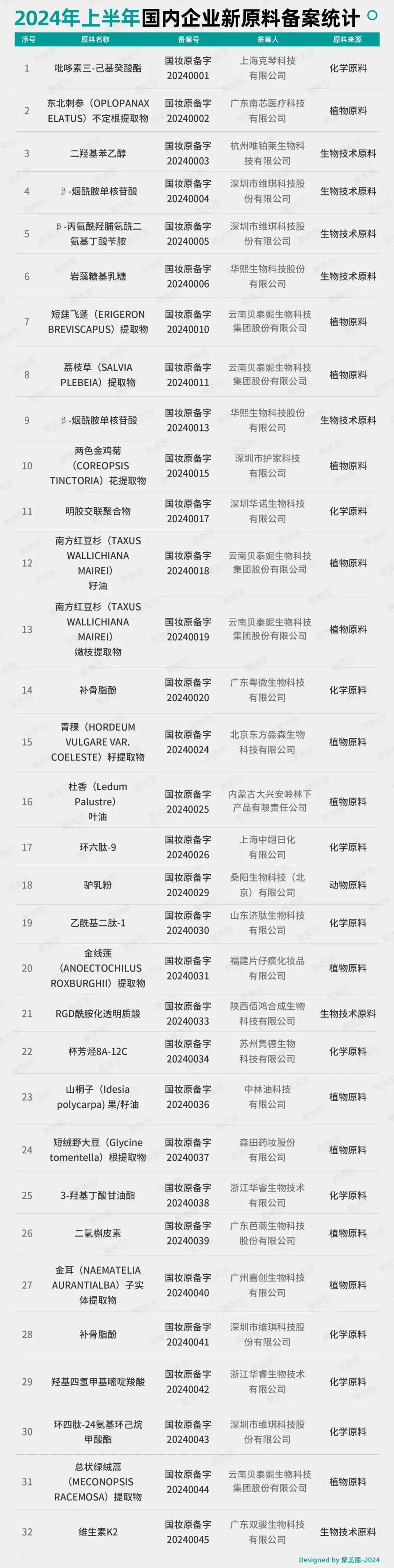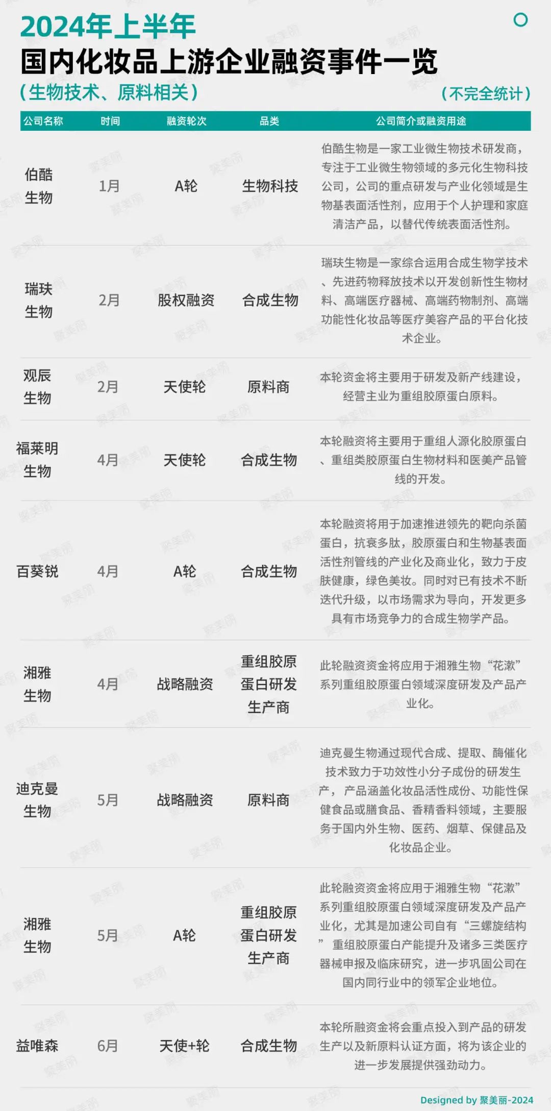 在投资市场方面,据聚美丽不完全统计,仅2024年上半年在原料技术相关的融资至少9起,而这也从侧面反应出资本市场对于上游原料的看好。