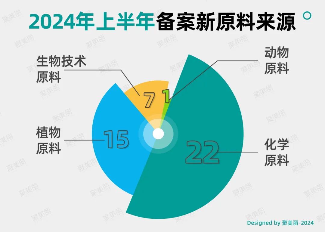 从原料来源来看,今年以来备案的新原料均未公开技术来源,但从备案名称也不难发现,45款新原料中,化学原料有22款,植物原料有15款,生物技术原料有7款,动物原料仅1款。