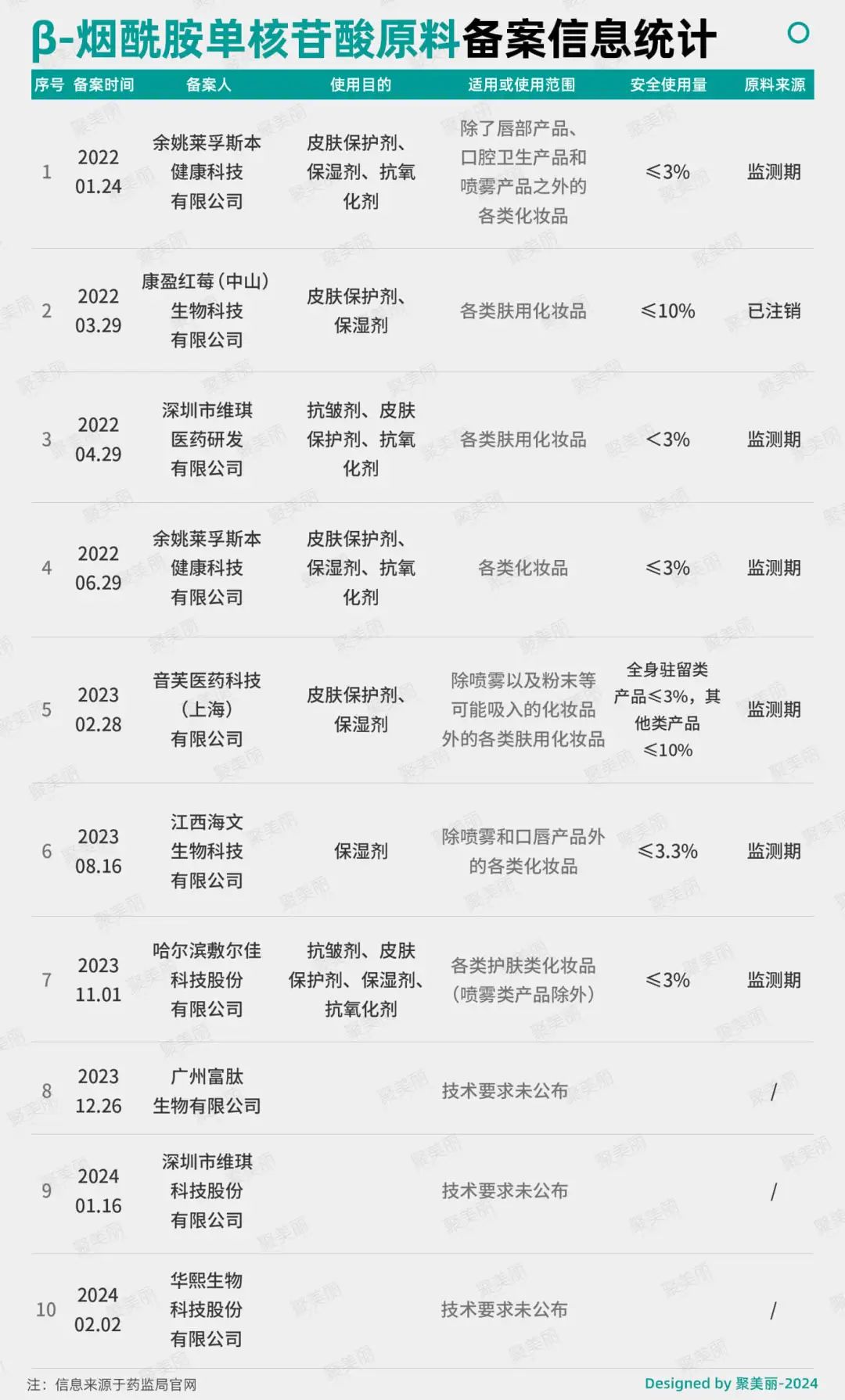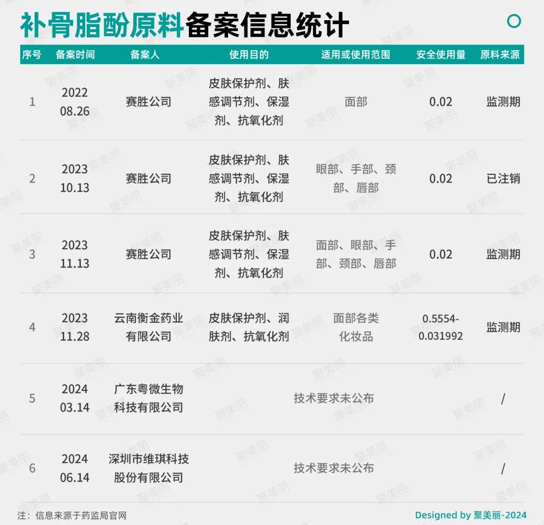 聚美丽经梳理后还发现,自化妆品原料备案开闸之日起,β-烟酰胺单核苷酸、补骨脂酚这两种抗衰原料被备案多次。