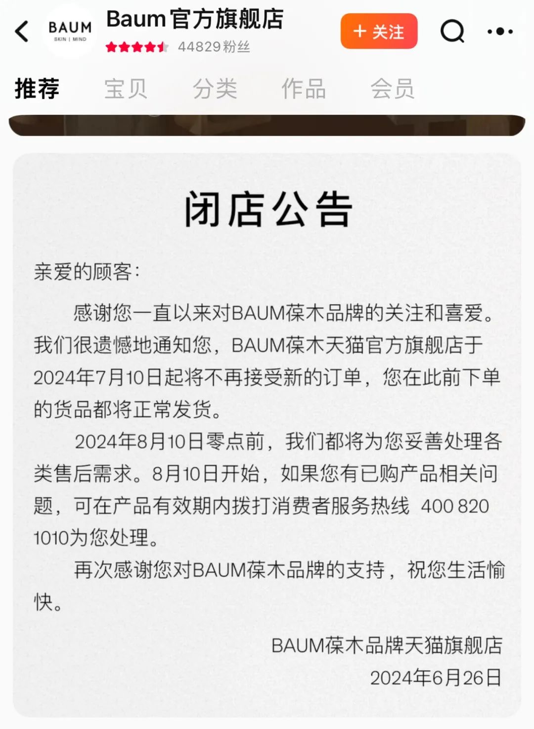 近日,资生堂旗下高端护肤品牌BAUM葆木在天猫及抖音旗舰店发布了闭店公告。