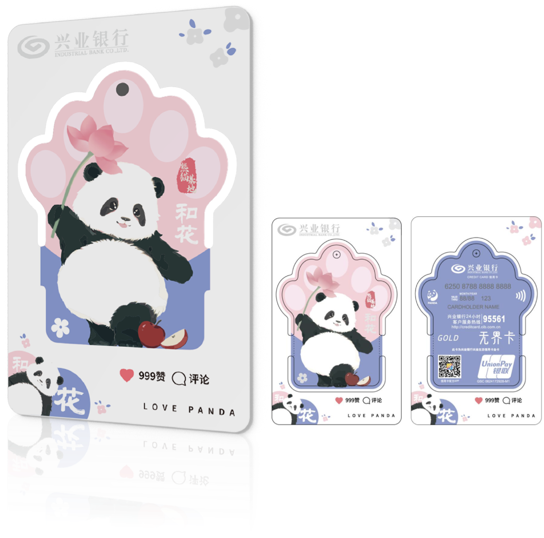 7月4日,兴业银行又创新推出“百变熊猫基地和花信用卡”配套特色卡面——“掌心和花版”,卡面突破了传统的信用卡设计,运用前沿的熊掌异形工艺和可拆卸设计,为卡片增添了更多趣味,也让“和花”手持荷花的形象更加俏皮灵动。