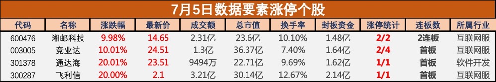 7月5日,数据要素概念延续强势,飞利信(300287)、通达海(301378)20CM涨停;湘邮科技(600476)2连板,竞业达(003005)涨停,三维天地(301159)、铜牛信息(300895)、零点有数(301169)等跟涨。