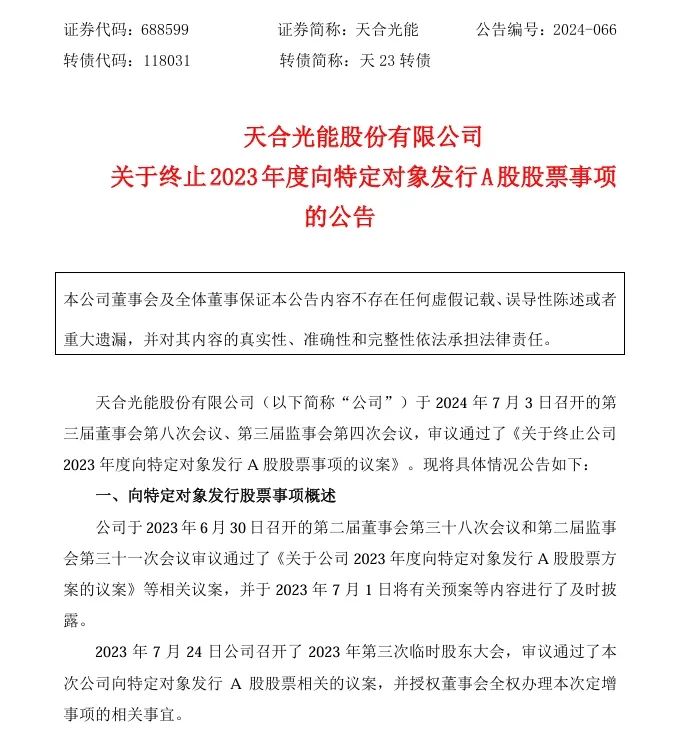 7月3日,天合光能披露《关于终止2023年度向特定对象发行A股股票事项的公告》。