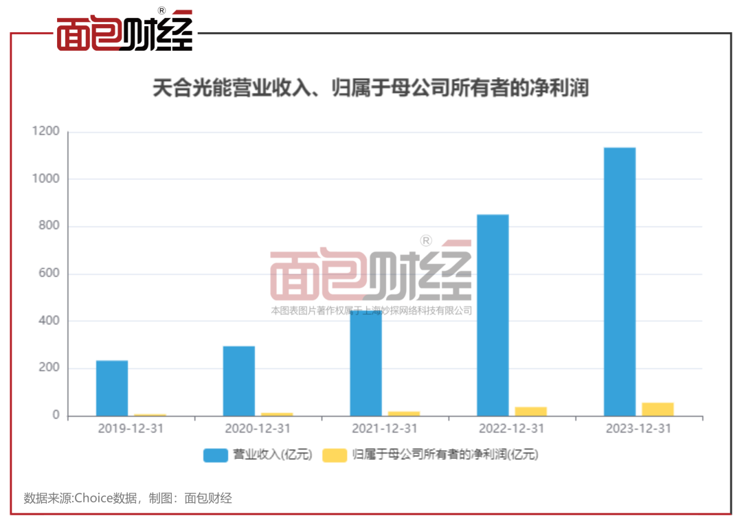 2023年,天合光能实现营收1133.92亿元,同比增长33.32%;归母净利润55.31亿元,同比增长50.26%。
