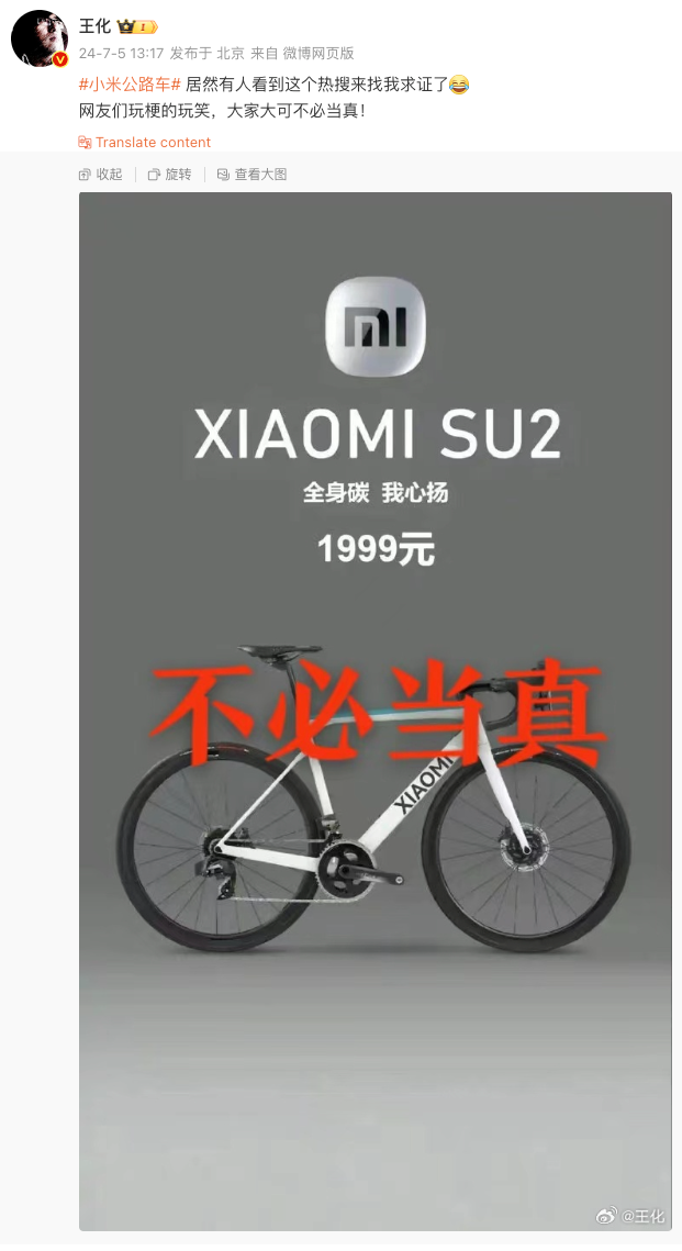 网传小米将推出售价1999元的公路车,7月5日,小米集团公关部总经理王化在微博发文予以否认:“网友们玩梗的玩笑,大家大可不必当真!”有网友在该条微博评论区建议小米考虑一下,王化回复:“没有这个考虑或规划!”