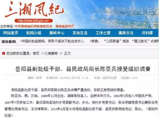 据三湘风纪报道,近日,岳阳县民政局6名副局长被立案审查。值得注意的是,在2016年12月7日,三湘风纪网曾发布消息:“岳阳县副处级干部、县民政局局长陈亚兵涉嫌严重违纪,目前正接受组织调查”。可以看到,岳阳县民政局1正6副7名局长已被“一锅端”,前后不足3个月。