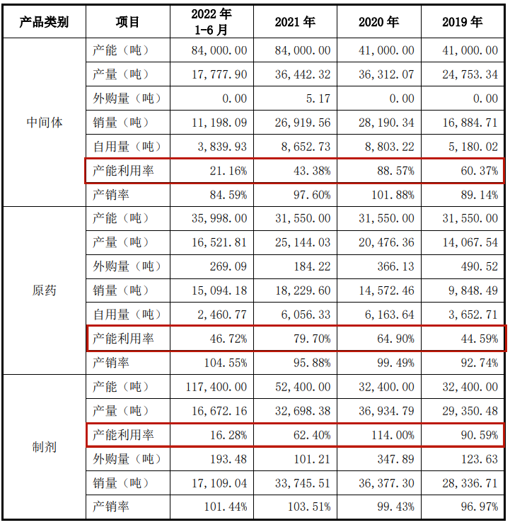 山东绿霸的招股书显示,从2019年至2021年以及2022年上半年(报告期),该公司产品中间体的产能利用率分别为60.37%、88.57%、43.38%和21.16%,呈总体下降的趋势;该公司原药的产能利用率分别为44.59%、64.9%、79.7%和46.72%;该公司制剂的产能利用率分别为90.59%、114%、62.4%和16.28%,也呈总体向下的趋势。由此可见,2022年上半年,山东绿霸的产能利用率总体不足五成,生产能力远远未能得到充分利用,而这与其核心产品受限、环保要求提高等因素存在直接关系。