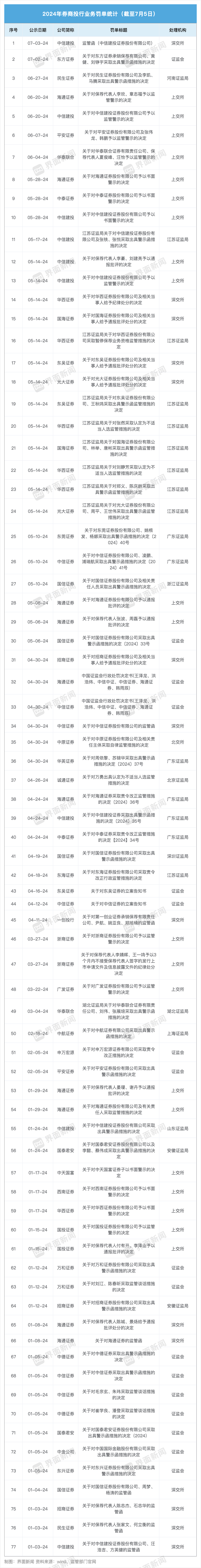据界面新闻记者不完全统计,截止7月5日,今年年内监管部门对券商出具的投行业务罚单总数已达77张,涉及32家券商。