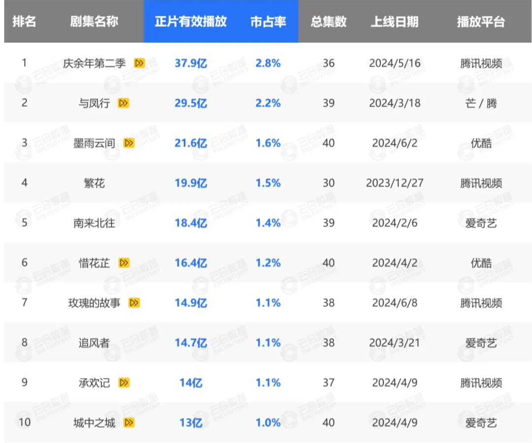 同时,根据云合数据显示,2024H1全网剧集有效播放第一名为37.9亿的《庆余年2》,虽然相较于去年一位《狂飙》的102.1亿有较大差距,但2024H1排在第二-五位剧集的正片有效播放都超过去年第三位《向风而行》的16.6亿,且第六位《惜花芷》正片有效播放也达到16.4亿,与《向风而行》基本持平。