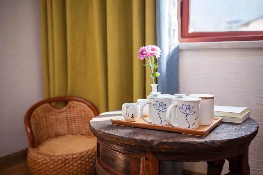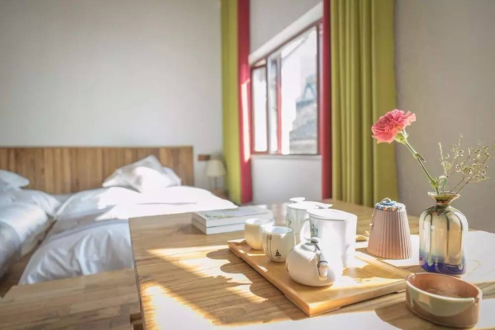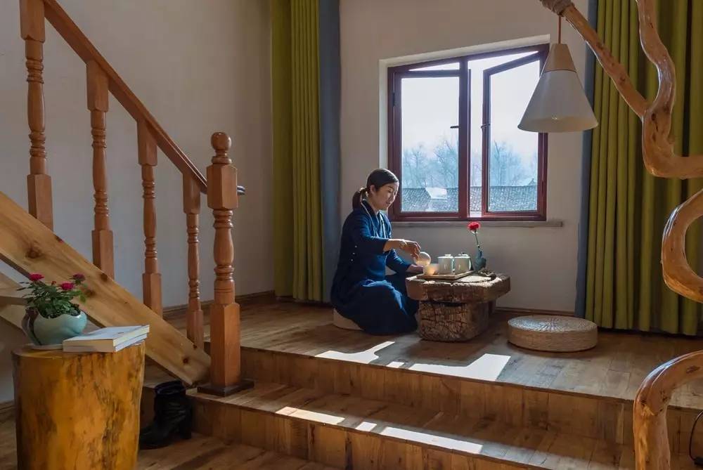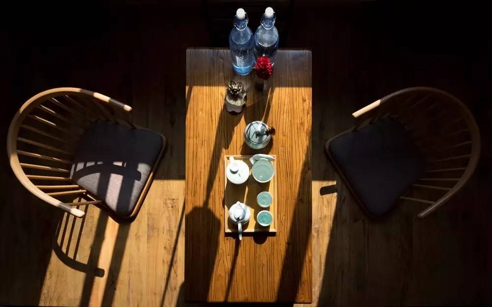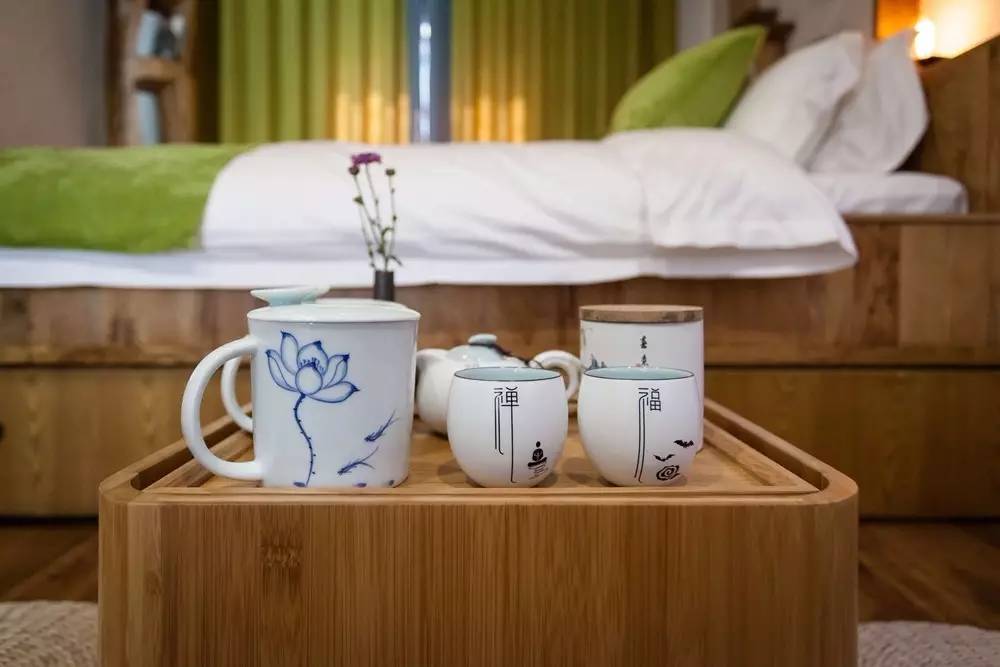 而且每一间客房都有一方精致的饮茶区,九华山天然山泉水、一套景德镇出品的精致茶具、上好的九华佛茶都已备好,只待你落坐~老榆木的素雅清香与氤氲一室的茶香一起营造出一份安逸温润,直让人不想出门。