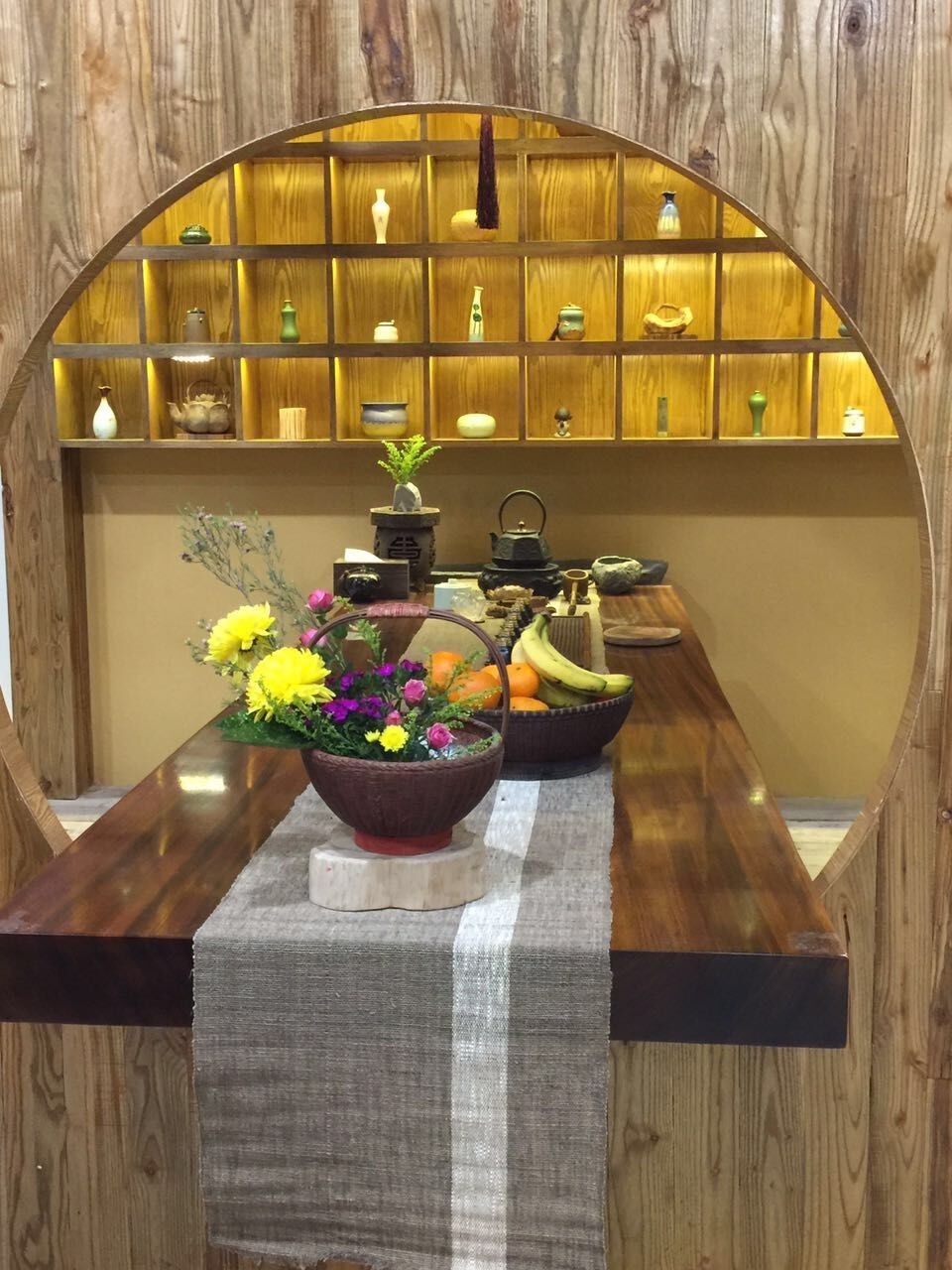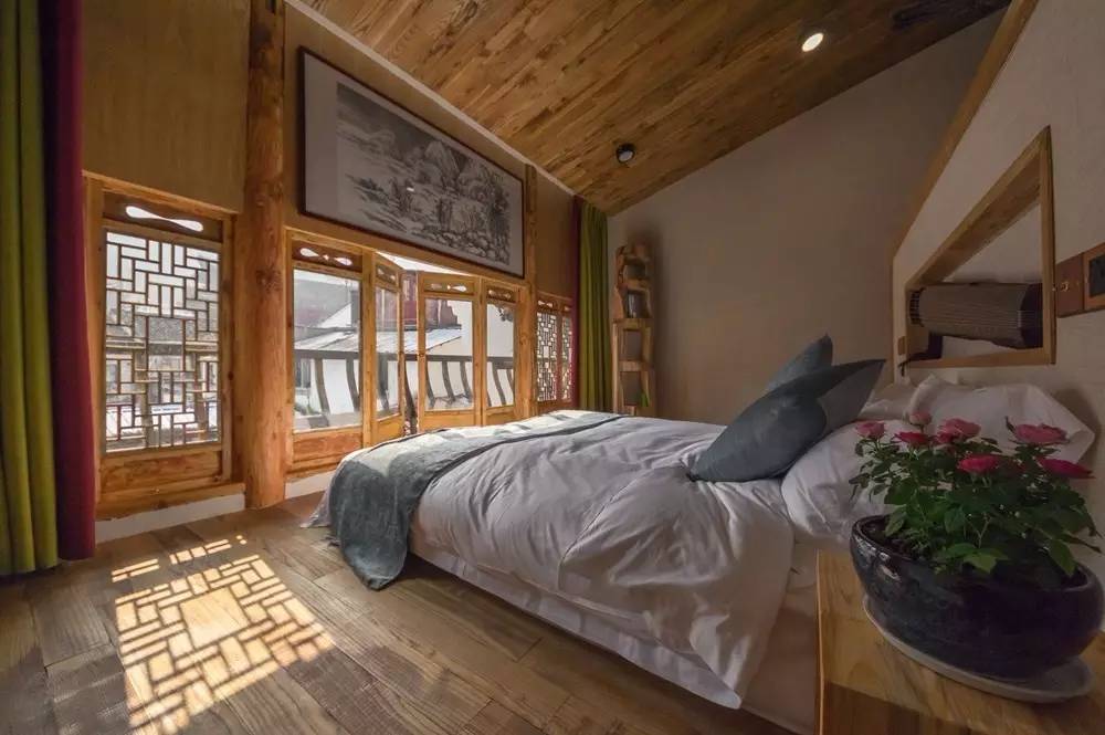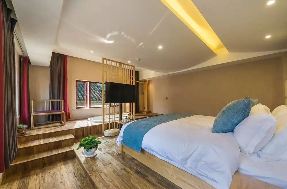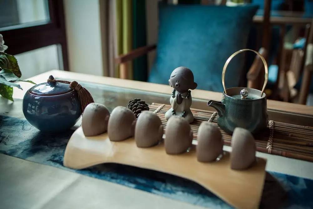 而且每一间客房都有一方精致的饮茶区,九华山天然山泉水、一套景德镇出品的精致茶具、上好的九华佛茶都已备好,只待你落坐~老榆木的素雅清香与氤氲一室的茶香一起营造出一份安逸温润,直让人不想出门。