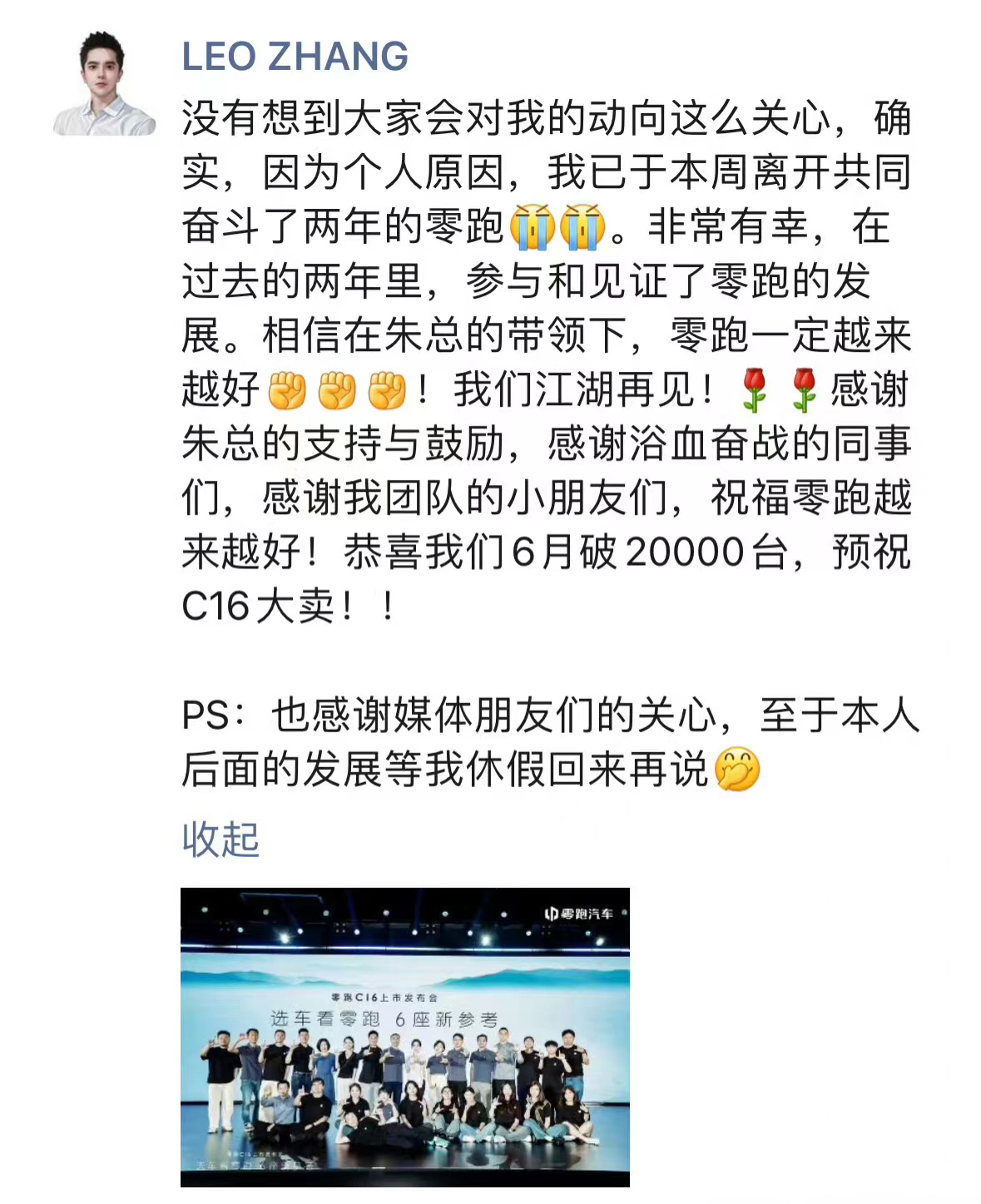 7月4日,零跑汽车原首席营销官张韦力在社交平台宣布因个人原因辞职,据悉,零跑董事、高级副总裁、整车产品负责人曹力接下来将分管品牌与市场。