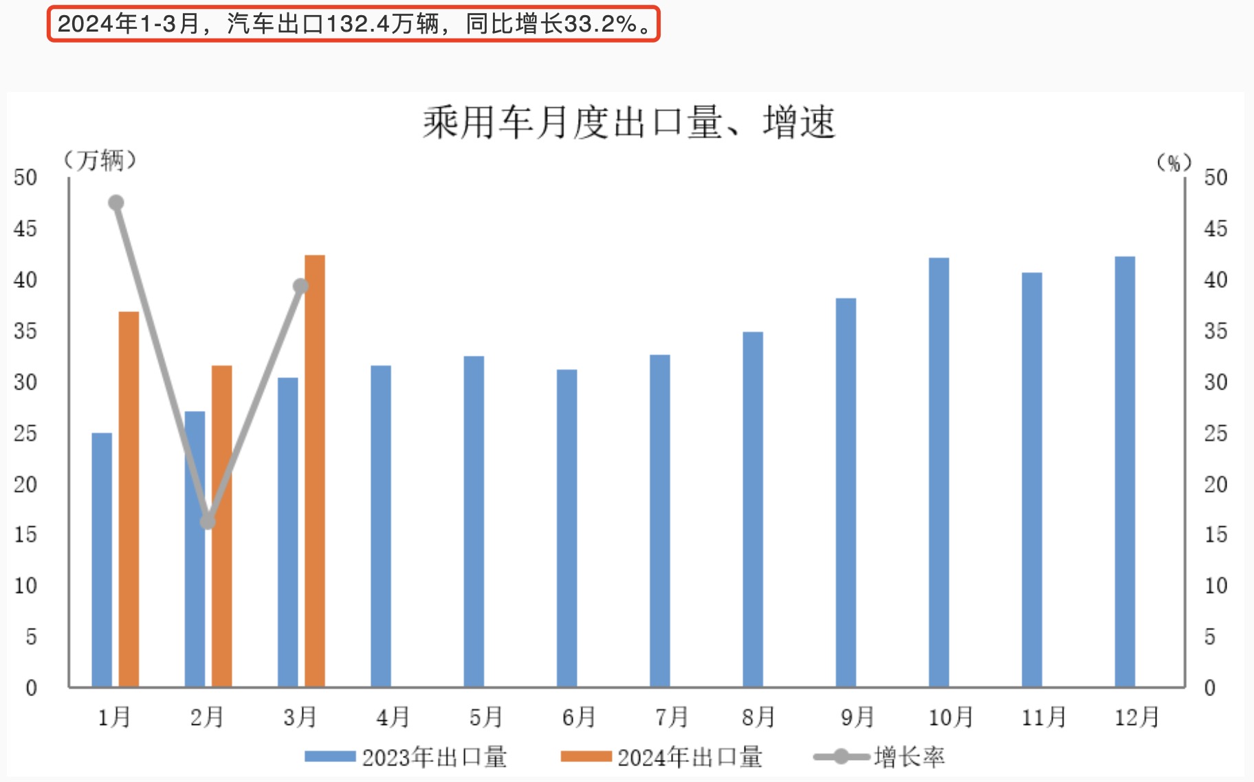 图/2024年Q1我国汽车出口量、增速 来源/中汽协