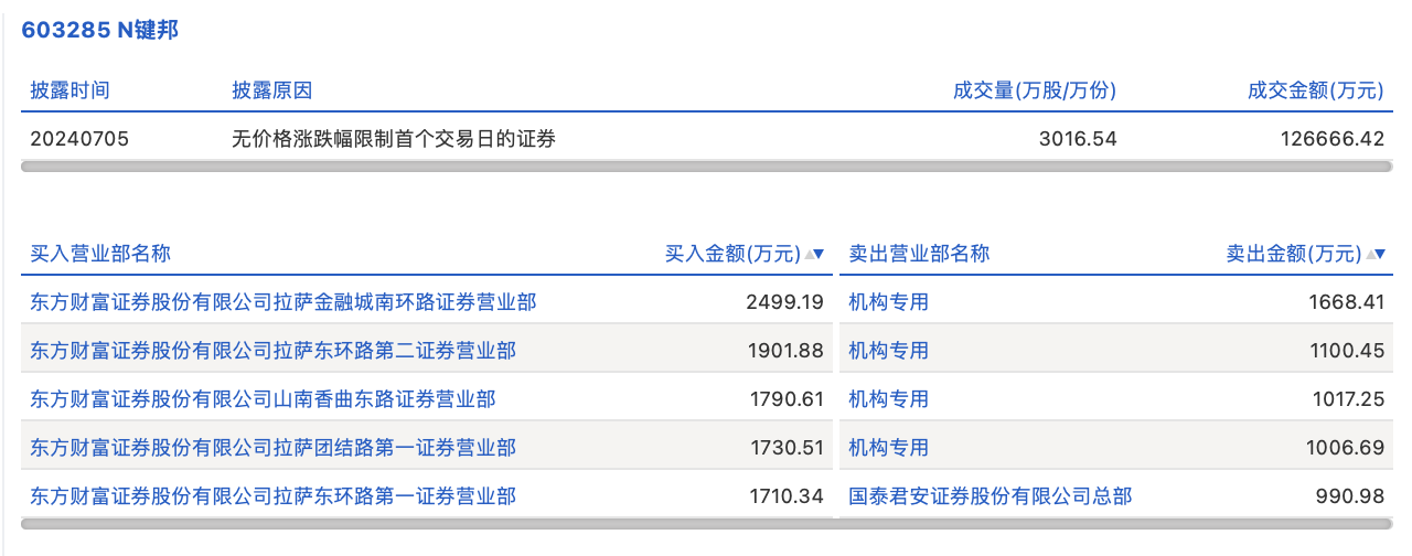 7月5日,新股键邦股份今日涨133.24%,龙虎榜数据显示,上榜营业部席位全天成交1.54亿元,占当日总成交金额比例为12.17%。其中,买入金额为9632.54万元,卖出金额为5783.78万元,合计净买入3848.76万元。