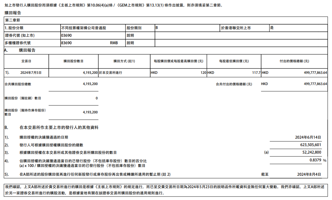 美团7月5日在港交所公告,耗资499777863.64港元回购4193200股B类普通股,回购价为117.7港元/股-120港元/股。