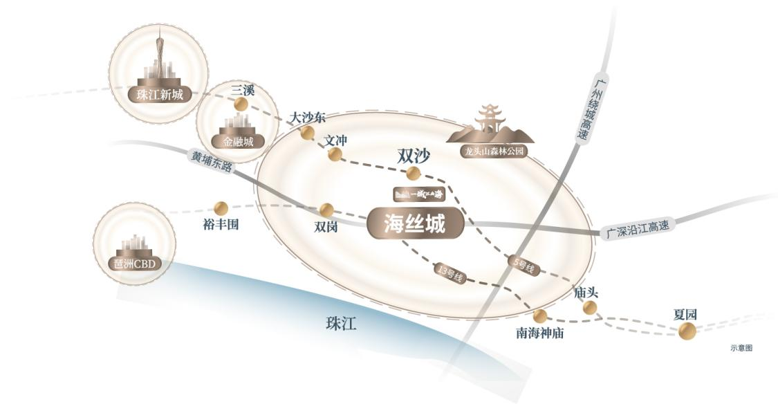 一城江山海·阅山组团位于海丝城的交通枢纽,紧邻5号线双沙B站出口,5站可达金融城,约30分钟可达珠江新城,近享黄金交通圈。紧邻广深沿江高速、广州绕城高速,畅享1小时湾区都市生活。