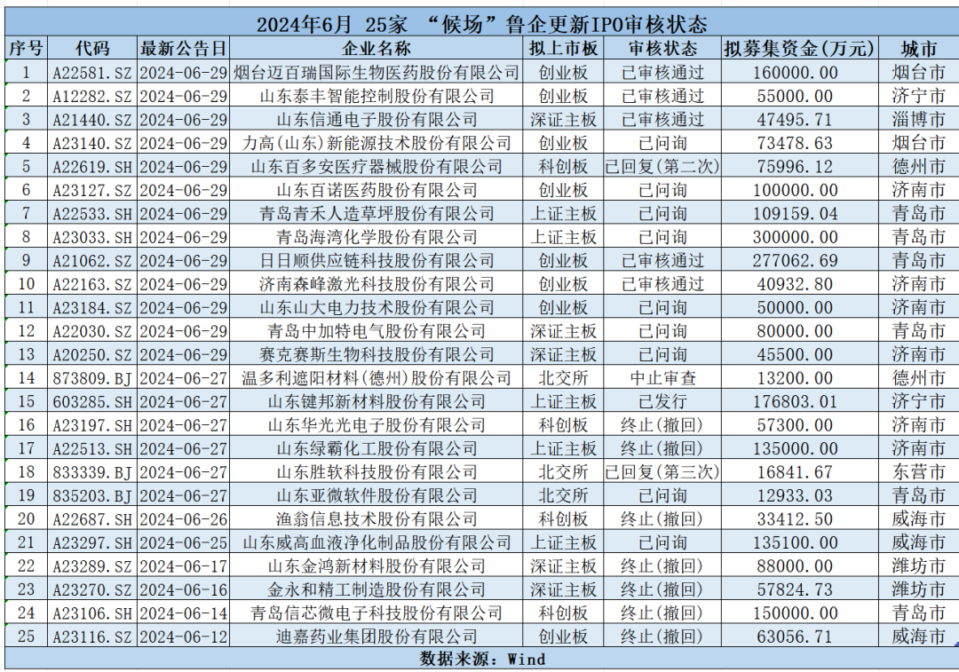 Wind数据显示,截至6月末,除去审核状态“终止”的情况,山东IPO排队在审企业共计22家。其中,上交所主板4家、科创板1家、深交所主板3家、创业板9家、北交所5家。