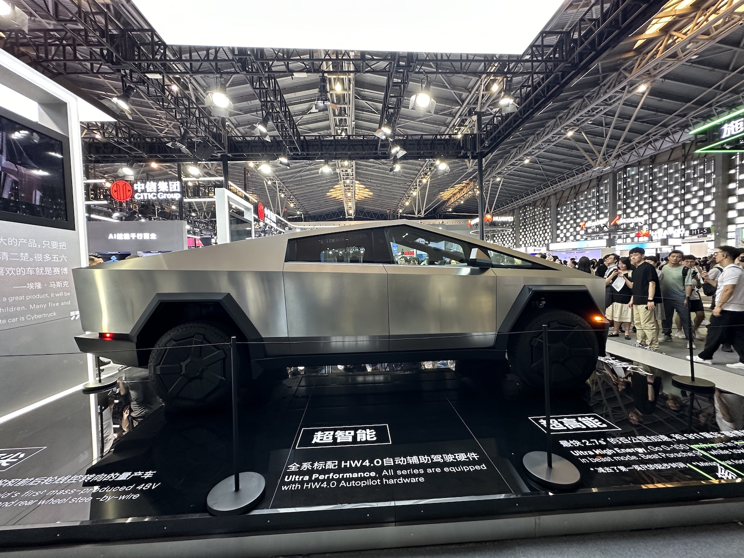 在展馆内,最受瞩目的则是一进大门就能看到的特斯拉展台,一辆颇具未来感的赛博越野旅行车(Cybertruck)被摆放在台上,其高辨识度的设计、金属质地的车身都让现场观众忍不住驻足观看。本次除了赛博越野旅行车,特斯拉还展出了Optimus人形机器人,以及FSD(完全自动驾驶能力)的最新成果。