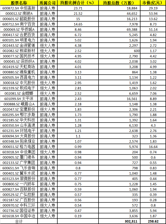以2月24日收盘价计算,前海、恒大人寿在A股持仓总市值近259亿元。